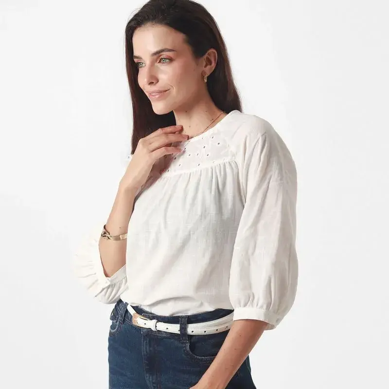 BLUSA ESCOTE REDONDO MANGA RANGLAN 3/4 RECOGIDO EN PUÑOS CON CORTE DELANTERO EN TELA COMBINADO