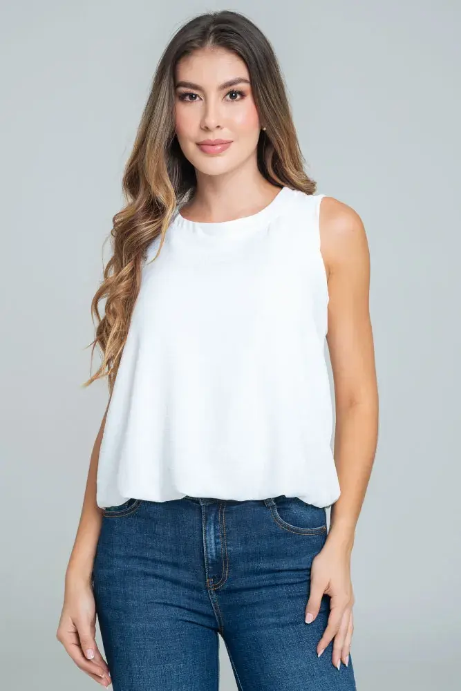 Blusa en tejido plano fondo entero, cuello de 2cms en la misma tela, manga sisa, cierre niquel con correder decorativa en la parte superior posterior, corte en centro espalda, terminación en ruedo tipo globo, silueta semi ajustada.