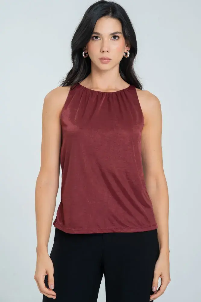 Blusa en tejido con acabado especial fondo entero, escote redondo con falso y recogido suave tanto en delantero como en posterior,sisa atlética,abertura con ojal en tela y botón de pata en la parte superior de la espalda,ruedo de 2cms,silueta semi ajutada