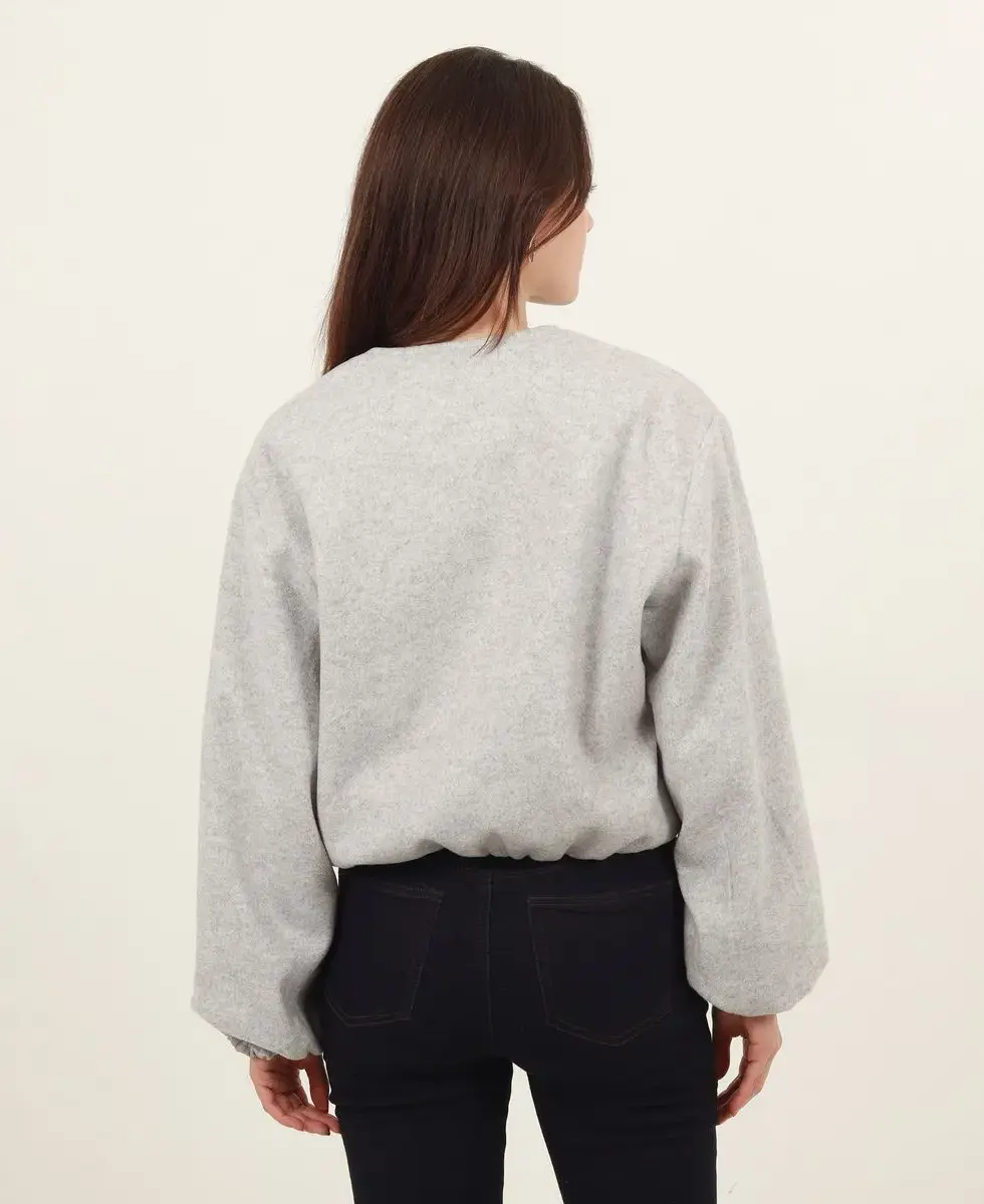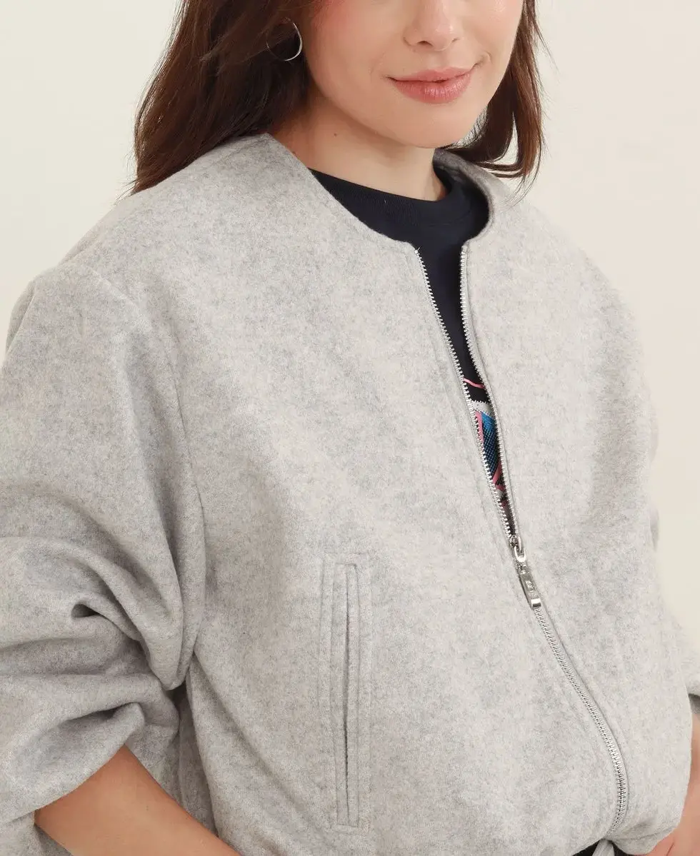 BOMBER CONFECCIONADA EN PANO POLIESTER CUELLO REDONDO CON SESGO INTERNO Y MANGA LARGA LARGA ABULLONADABAJO CON PLIEGUES ABULLONADO CIERRE FRONTAL CON CREMALLERA