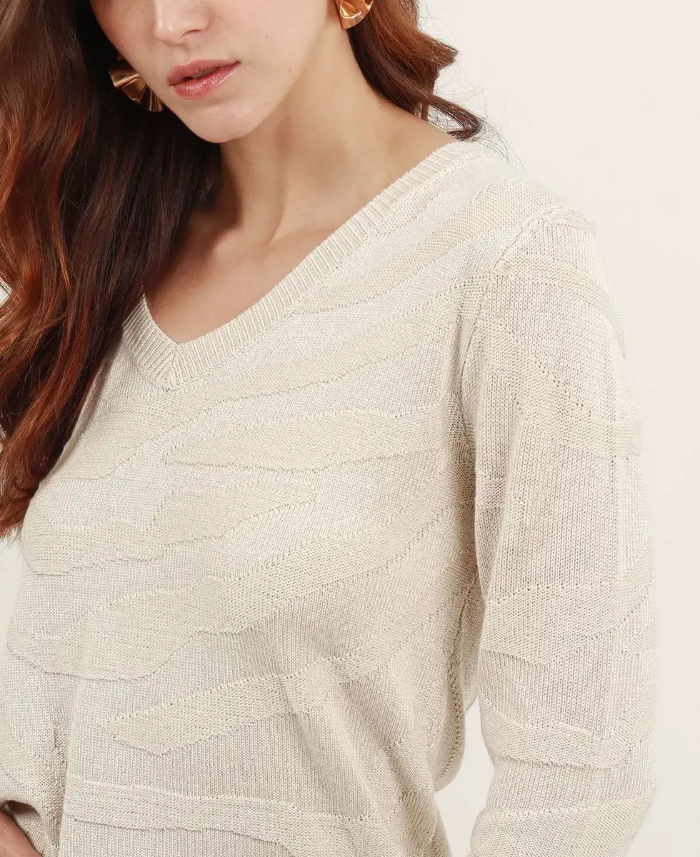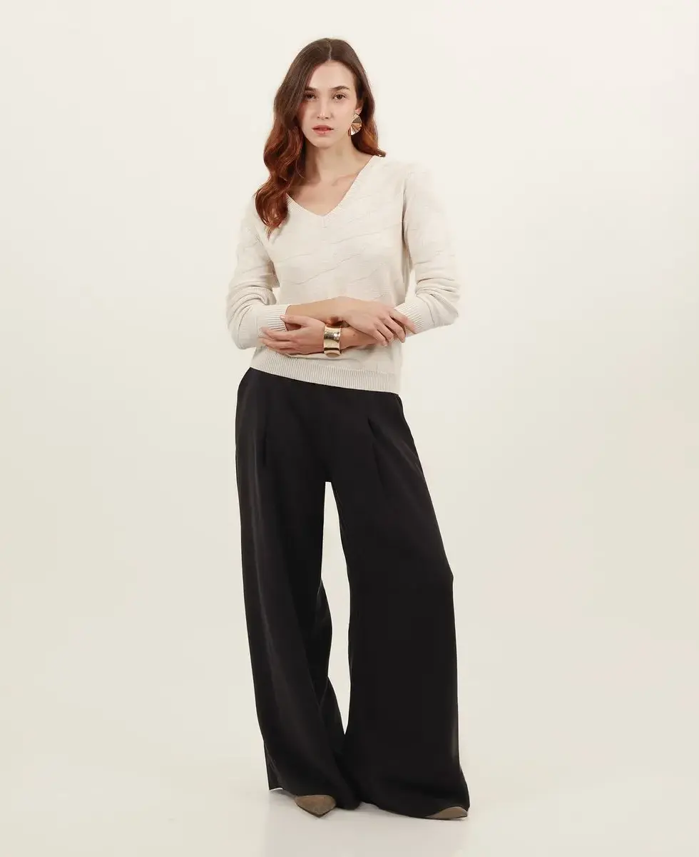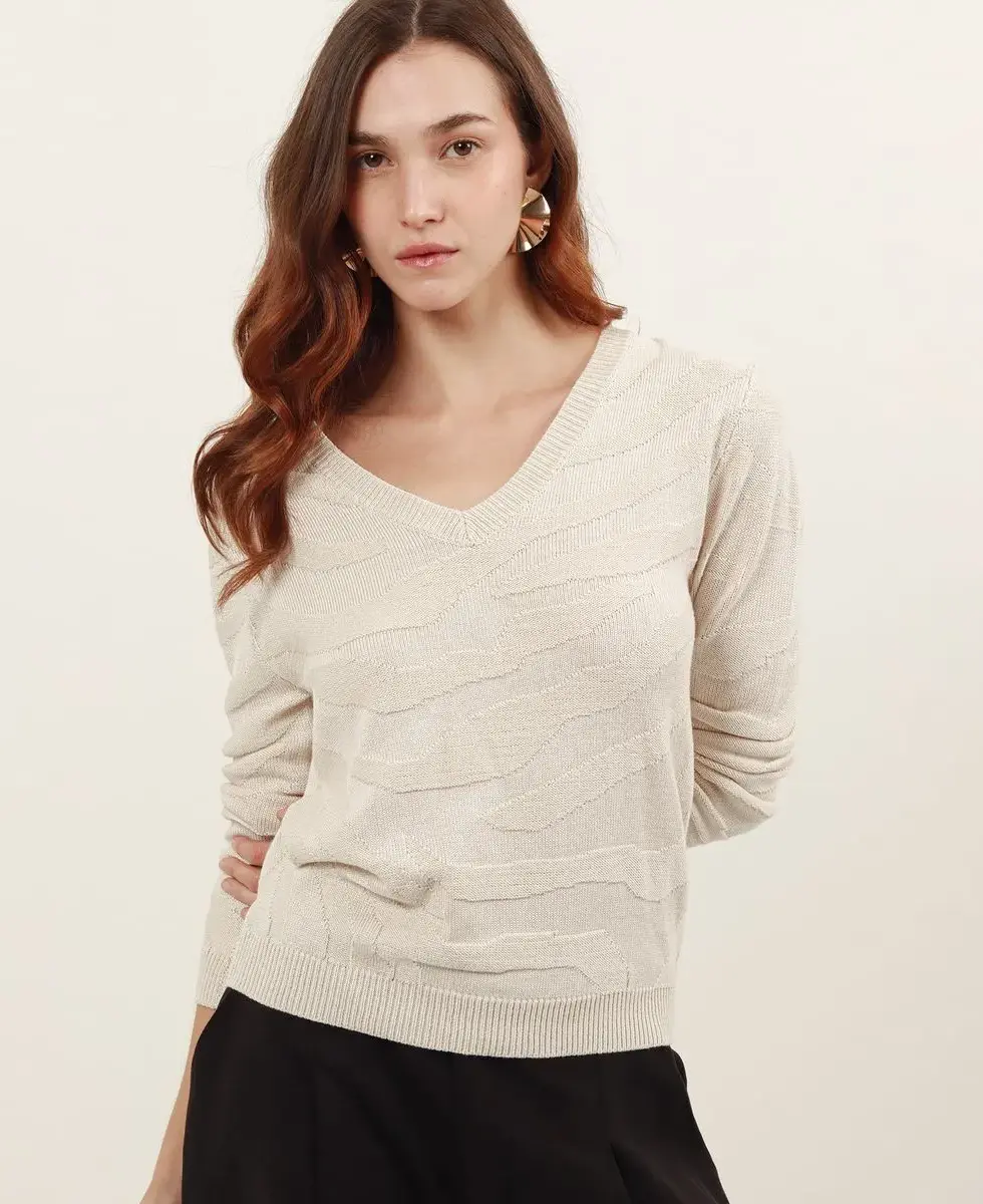 JERSEY EN PUNTO DE JAQUARD CON SECCIONES EN PUNTO CANALE EN PUNOS CUELLO Y BAJO. MODELO CON ESCOTE DE PICO PROFUNDO Y BAJO RECTO