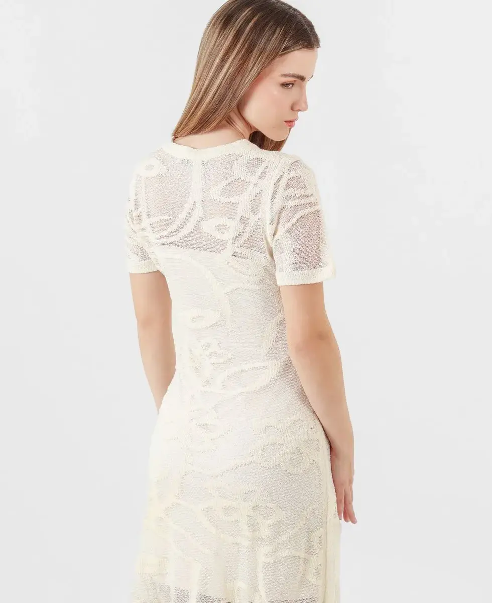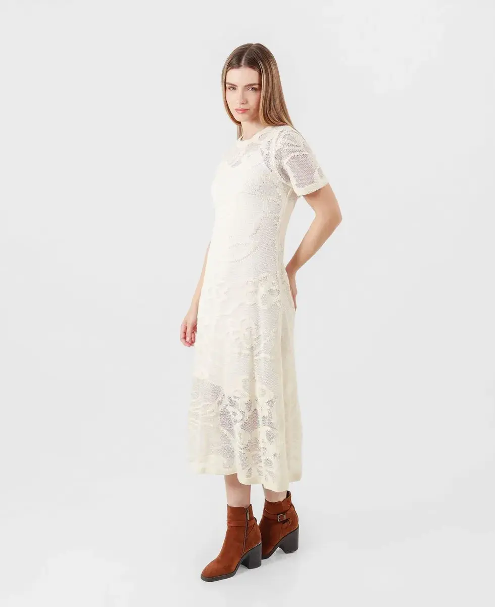 VESTIDO MIDI MANGA CORETA CUELLO REDONDO ABIERTO CON FALDA EVASE EN TEJIDO PUNTO JAQUARD
